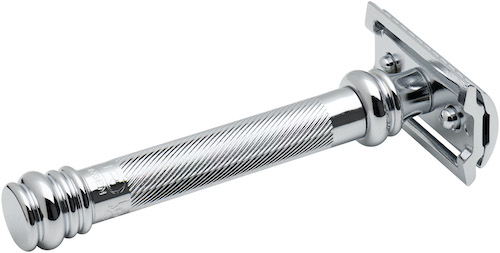 Brass handle, die-casted zinc razor head, galvanized surfaces, bright chrome-plated.