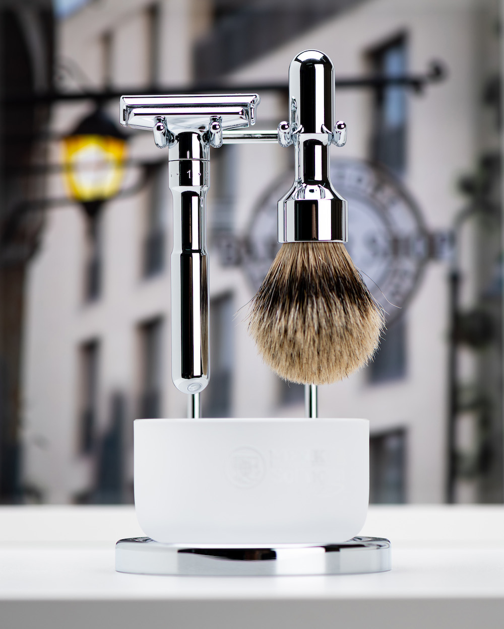 - Set bestehend aus Rasierer 701001 Glanzchrom, Pinsel 1701001 Glanzchrom, Rasierständer 4751 Glanzchrom und Seifenschale 4000. Zusätzlich 10 Klingen MERKUR SUPER.