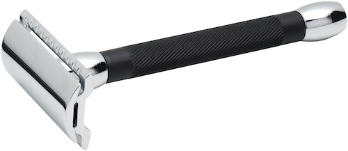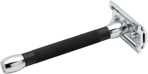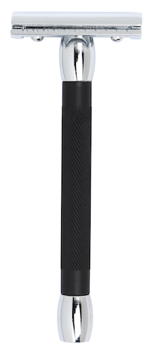 Griffstück aus Messing und schwarz eloxierten Aluminium, Zinkdruckguss-Rasierkopf, Oberflächen in Glanzchrom galvanisch beschichtet