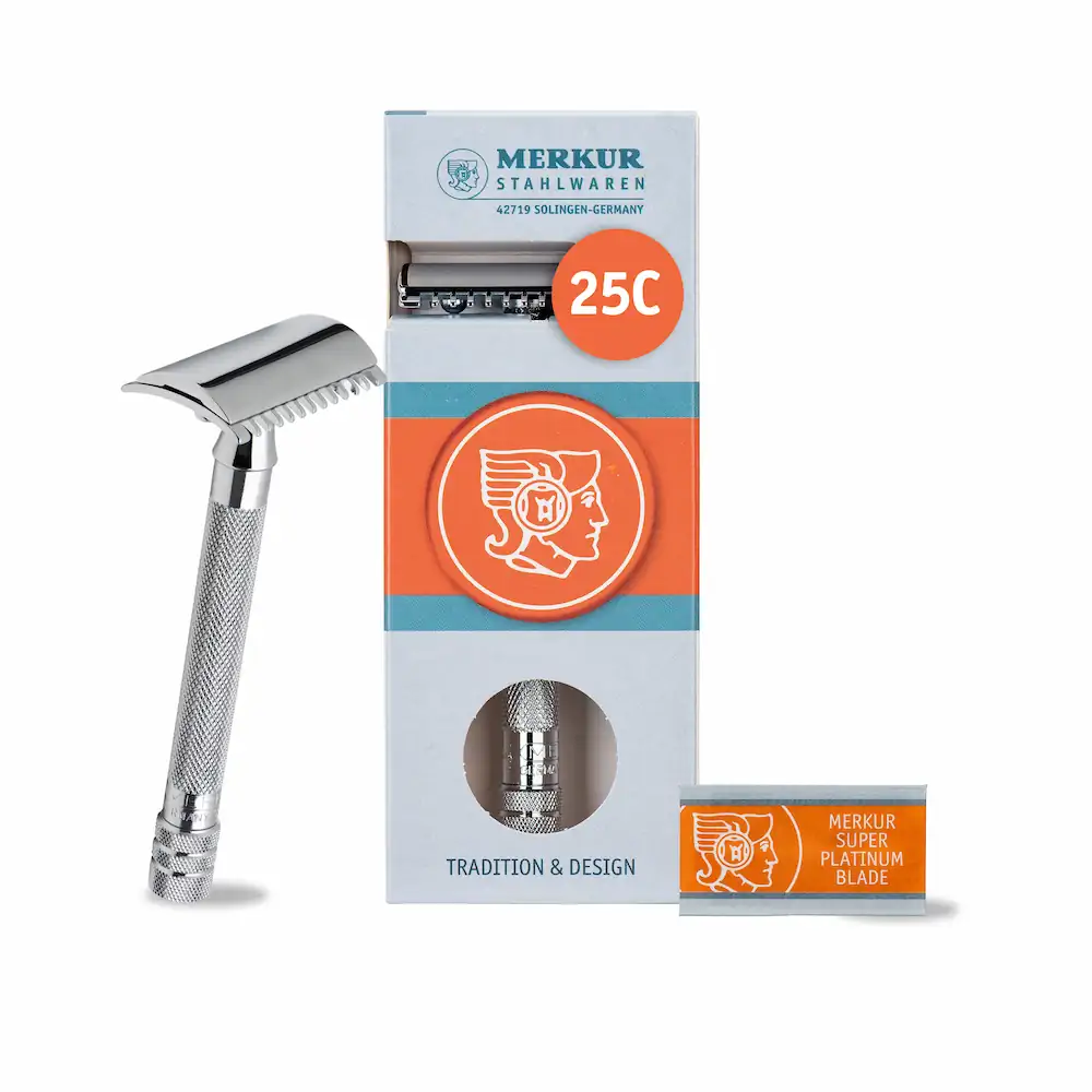 Der MERKUR 25C wurde ursprünglich in den 1920er Jahren entwickelt. Sein ursprüngliches Design und die zuverlässige Qualität machen ihn zu einem zeitlosen Klassiker: Der lange Griff mit dem Knauf am Ende und dem Kreuzrändel in diamantform geben guten Halt auch mit nassen, seifigen Fingern. Die gerade Schaumkante des seit 100 Jahren bewährten Rasierkopfes sorgt zuverlässig für eine glatte Rasur.