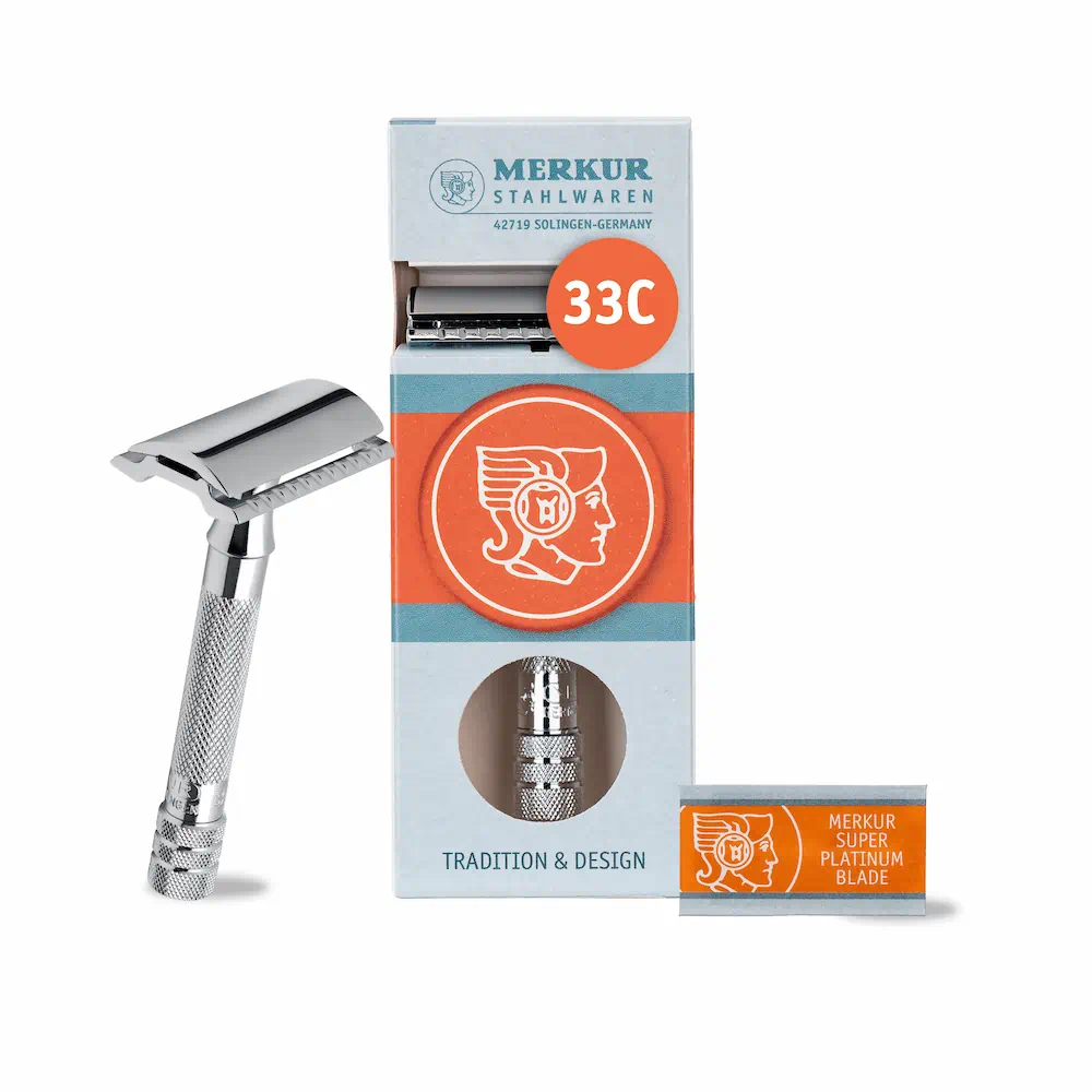 Der MERKUR 33C wurde vor mehr als 100 Jahren in den Anfängen der Hobelrasur entwickelt. Sein ursprüngliches Design und die zuverlässige Qualität machen ihn zu einem zeitlosen Klassiker: Der Griff und der Knauf mit dem Kreuzrändel in diamantform geben guten Halt auch mit nassen, seifigen Fingern. Die gerade Schaumkante des seit 100 Jahren bewährten Rasierkopfes sorgt zuverlässig für eine glatte Rasur.