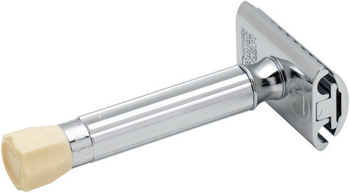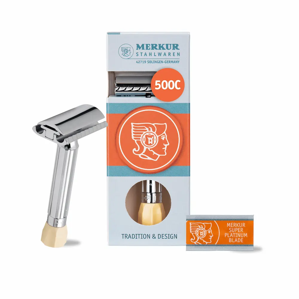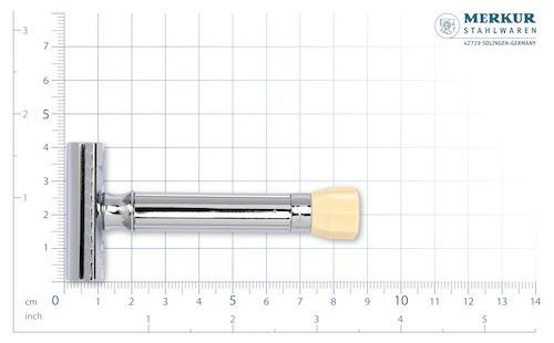 Der MERKUR 500 Progress Rasierhobel ist ein Model der 1950er Jahre. Der elfenbeinfarbene Knauf und das profilierte Griffrohr entsprechen dieser Zeit. Damit ist der Rasierkopf über eine Einstellskala zu justieren. Von der zartesten Rasur bis zum kräftigen Ausrasieren sind der Anstellwinkel und der Klingenspalt einzustellen. So steht deiner individuellen und makellosen Rasur nichts im Wege.