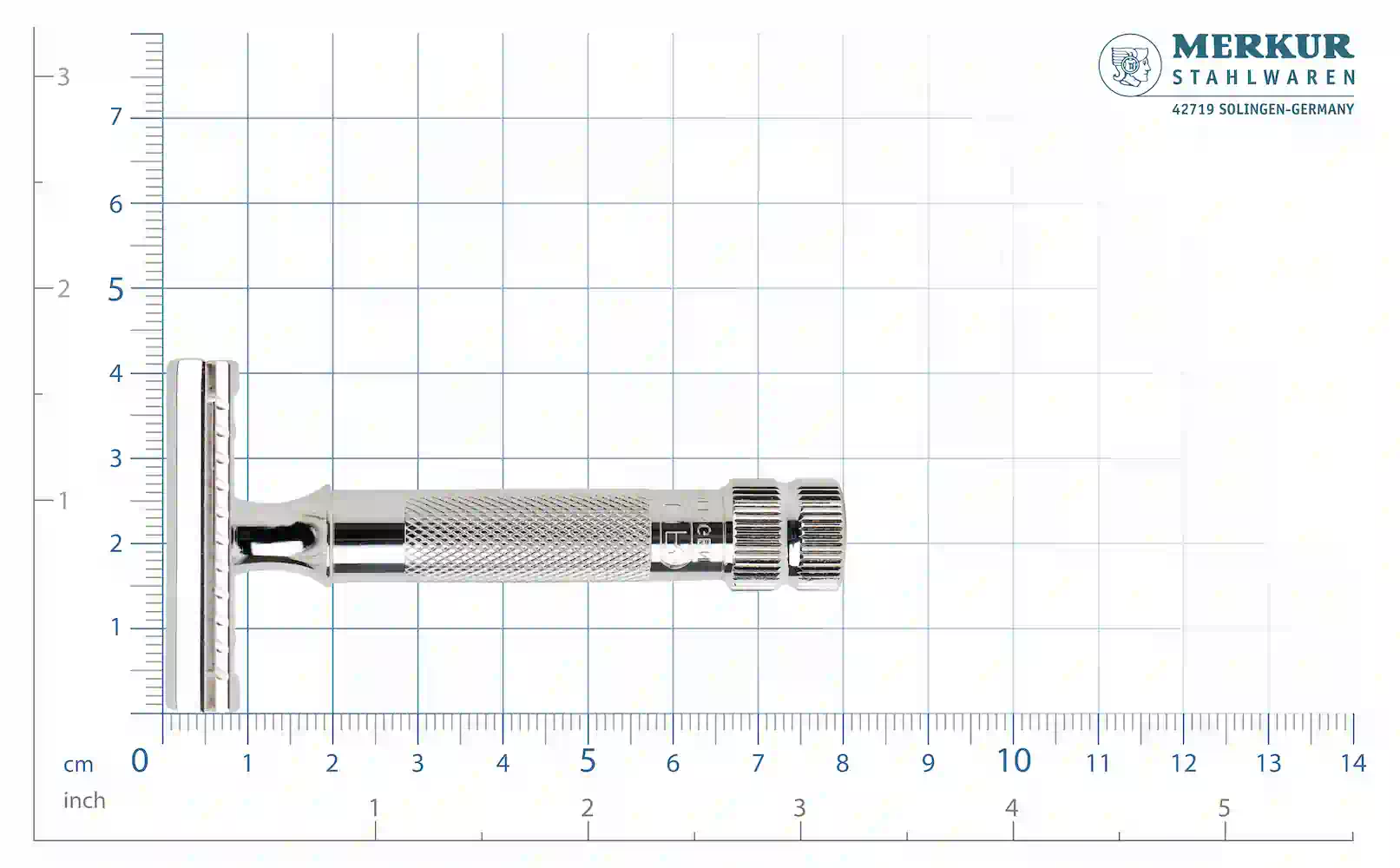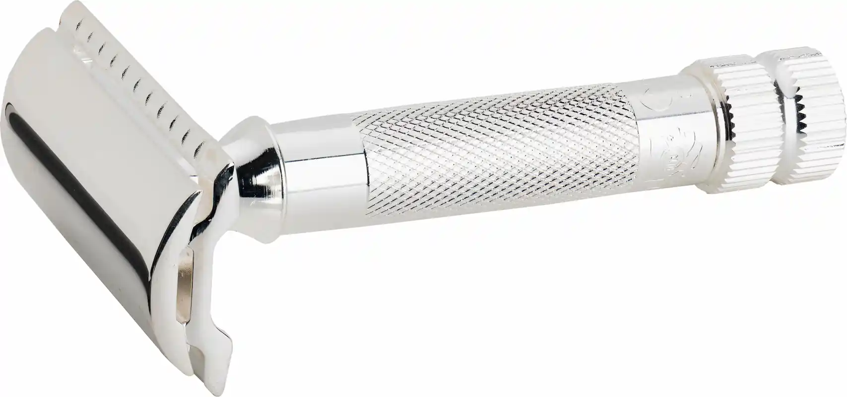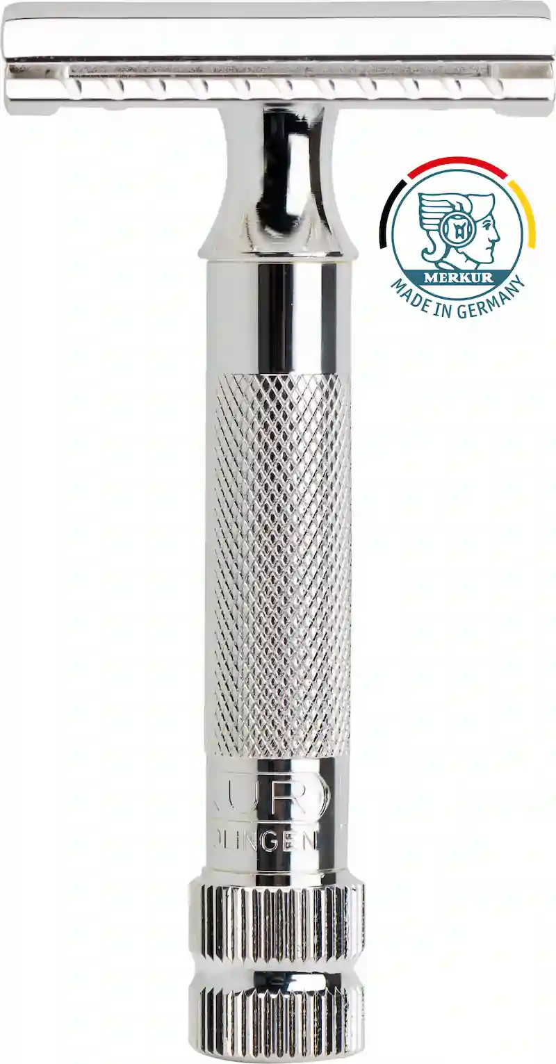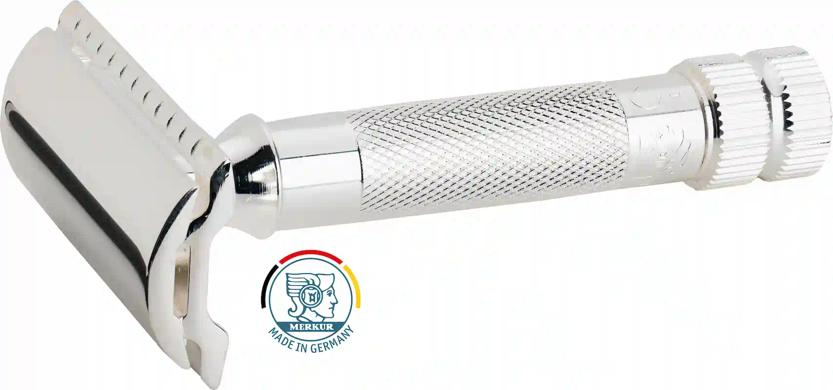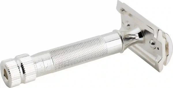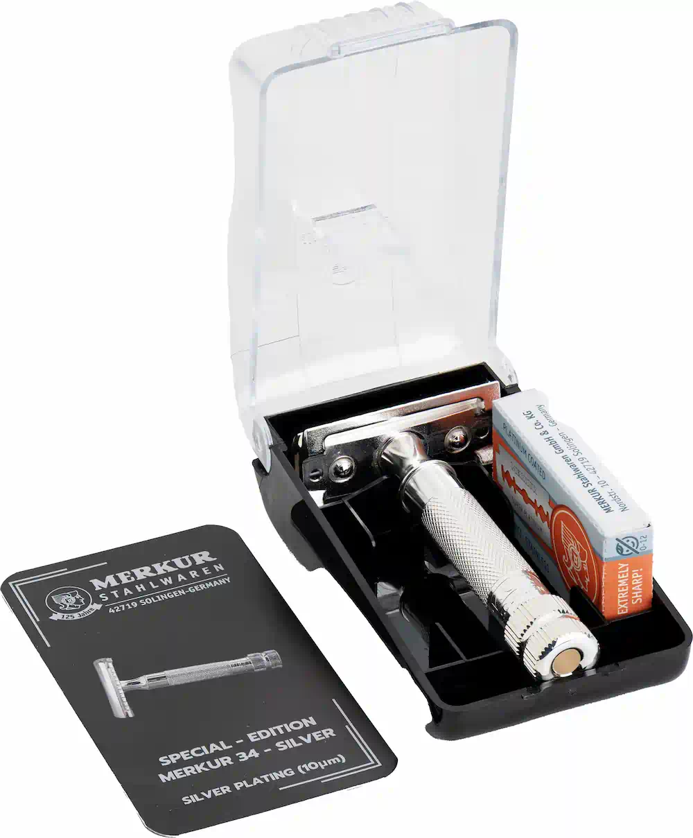 Griffstück aus Messing, Rasierkopf mit Deckel und Kamm aus Zinkdruckguss, Oberflächen in Silber galvanisch beschichtet. Rasierklingen rostfrei Edelstahl.
