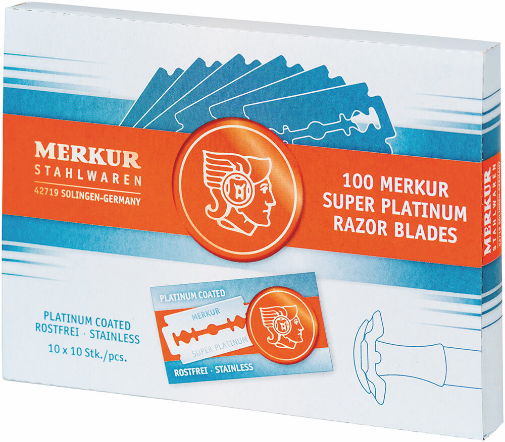 Rasierklingen sind ein sehr subjektives Pflegeprodukt. Die persönlich beste Klinge zu finden ist nicht einfach, zu unterschiedlich sind Haar- und Hauttyp des Benutzers. Die MERKUR Super Platinum aus Sandvik Edelstahl zählen mit den Platin und Teflon beschichteten Schneiden zu den ‘Superior’ Klingen, der höchsten Qualitätsstufe. Sie passen auf alle gängigen DE ‘Double Edge’ Doppelklingenrasierer. Die Packungseinheit ist 100 Stück (10×10), jede einzeln in Papier verpackt.