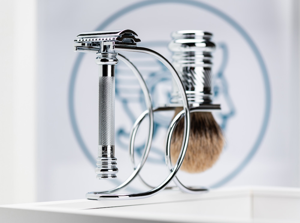 Ein zeitloser Designklassiker, bestehend aus dem eleganten Rasierer 38C mit dem passenden Rasierpinsel und dem dazugehörigen Ordnungssystem für dein Badezimmer.