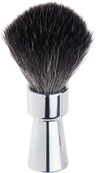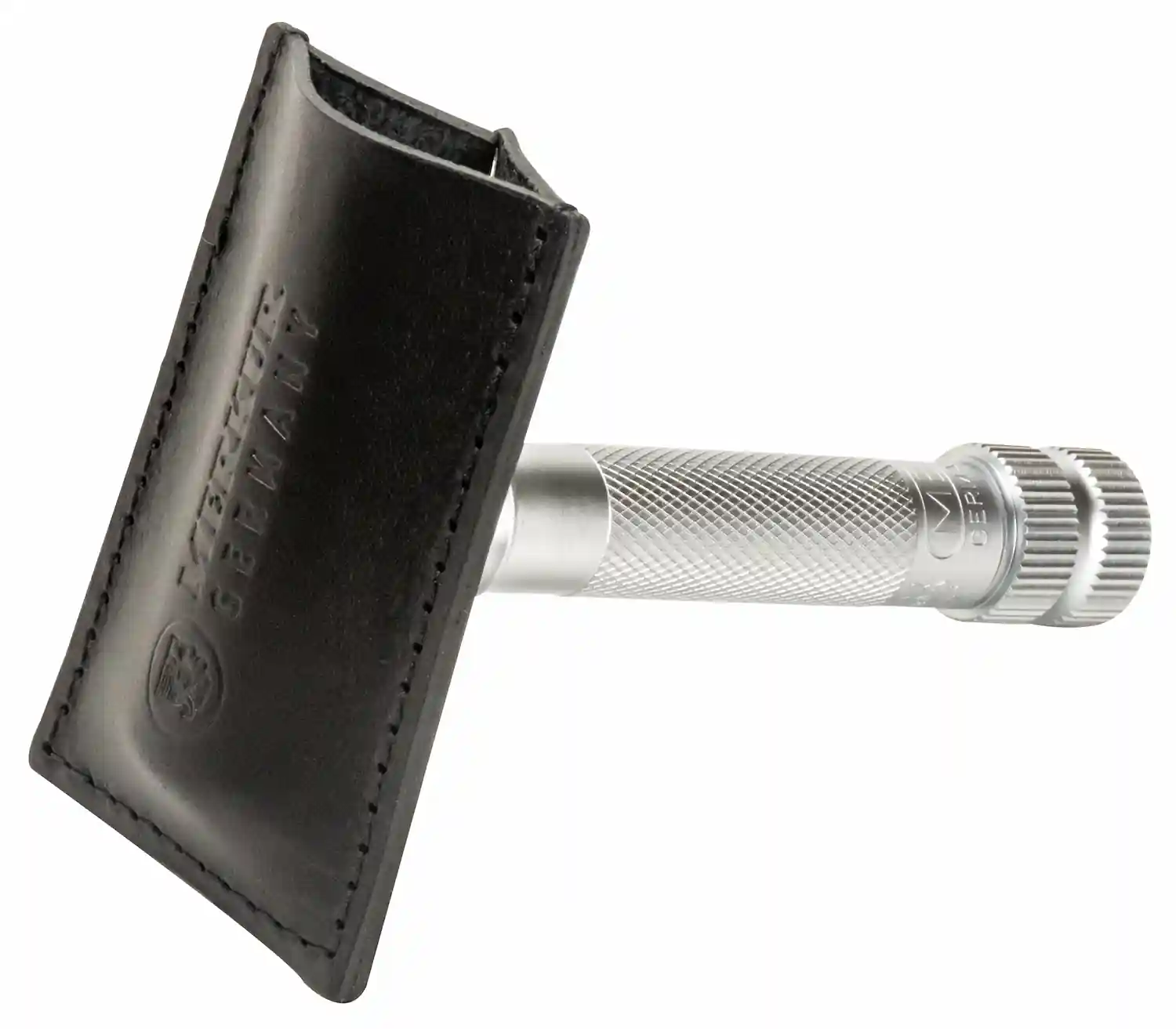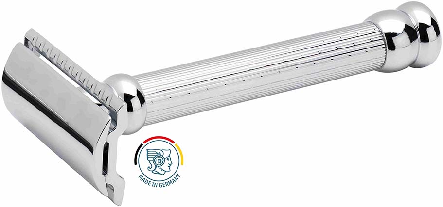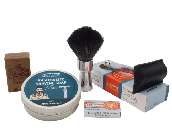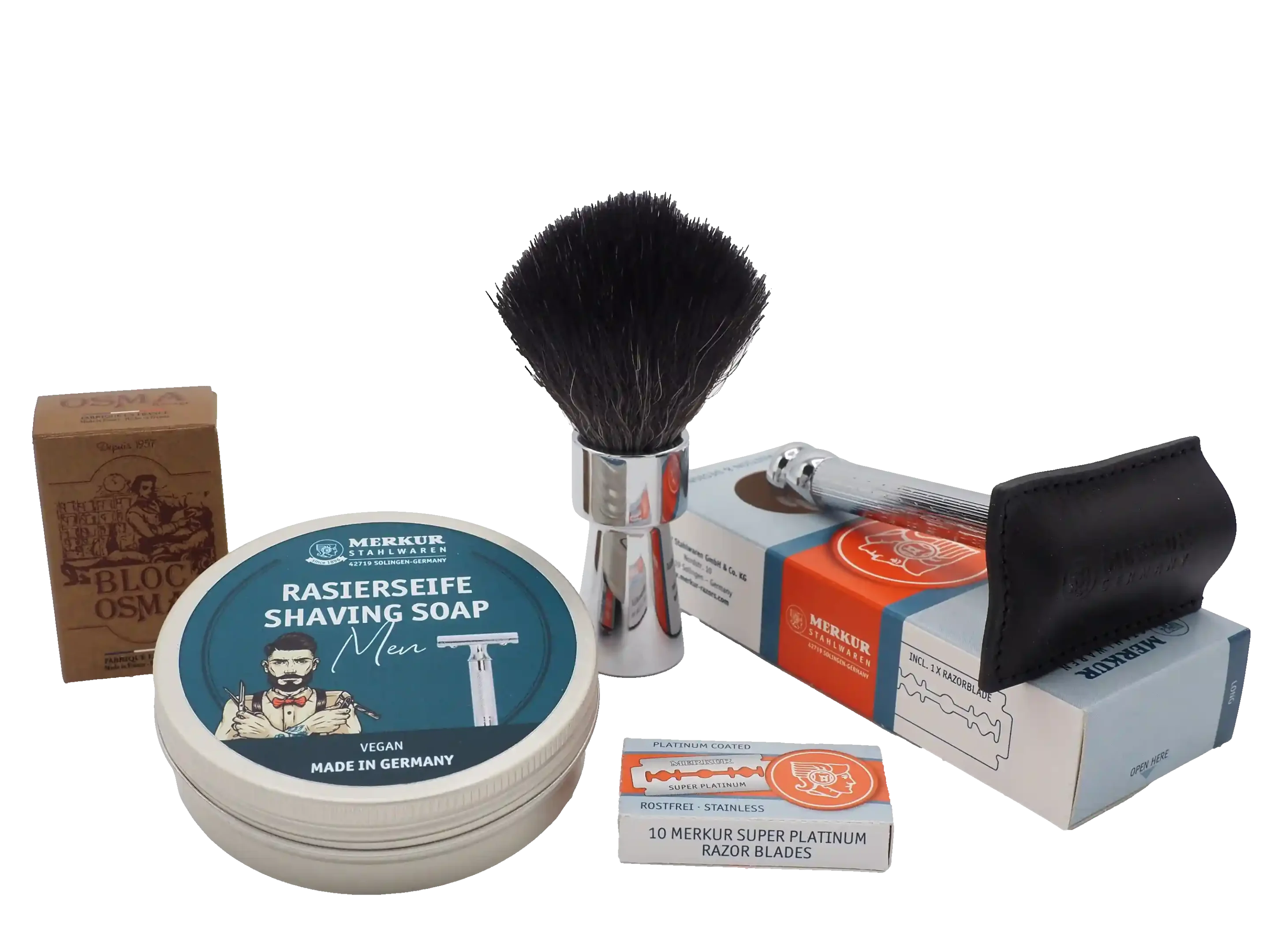 Set mit Rasierer 47C, Klingenschutz 5007, Rasierpinsel 1100, Rasierseife, 6900 Men, Alaunblock und 10 Rasierklingen. Griffstück aus Messing und Rasierkopf aus Zinkdruckguss, Oberflächen in Glanzchrom galvanisch beschichtet.