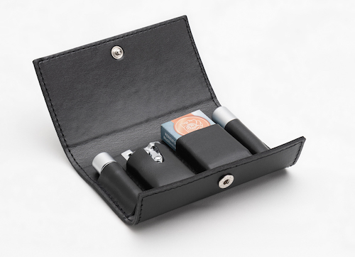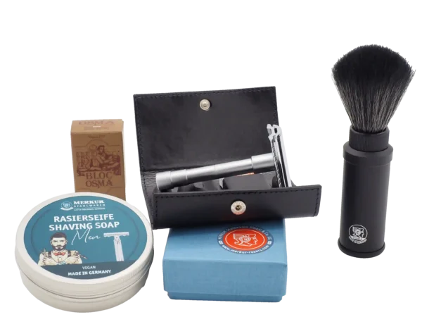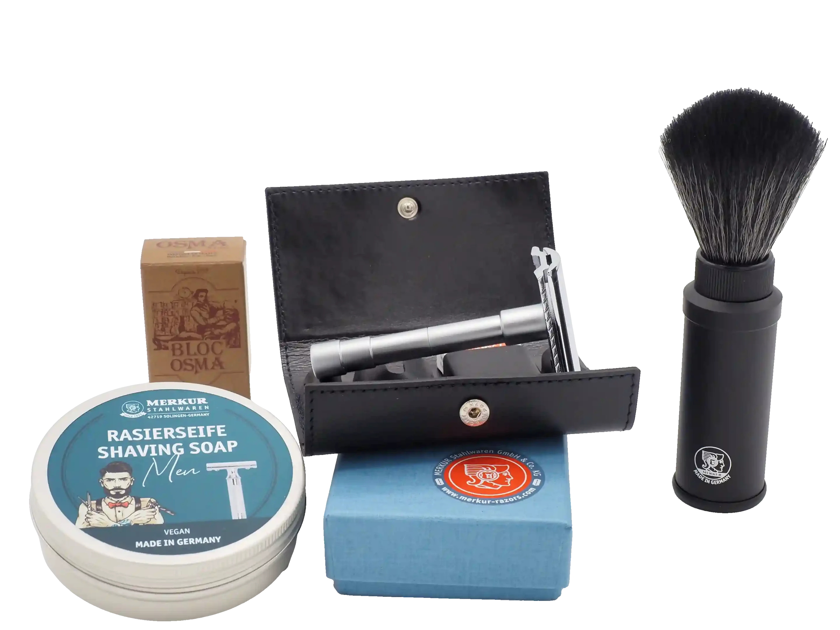 Set mit Rasierer 46 mit 10 Klingen im Lederetui, Rasierpinsel 1300, Rasierseife 6900 Men, Alaunblock. Griffstück aus Messing und Rasierkopf aus Zinkdruckguss, Oberflächen in Glanzchrom galvanisch beschichtet. Griffstück aus matt eloxierten Aluminium, Zinkdruckguss-Rasierkopf, Oberflächen in Glanzchrom galvanisch beschichtet. Schwarze Lederhülle, Rasierklingen Edelstahl Rostfrei. Die verbindliche Angabe der Inhaltsstoffe entnimm bitte der Verpackung des gelieferten Produktes oder dem Aufdruck direkt auf dem Artikel.