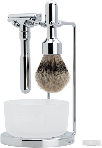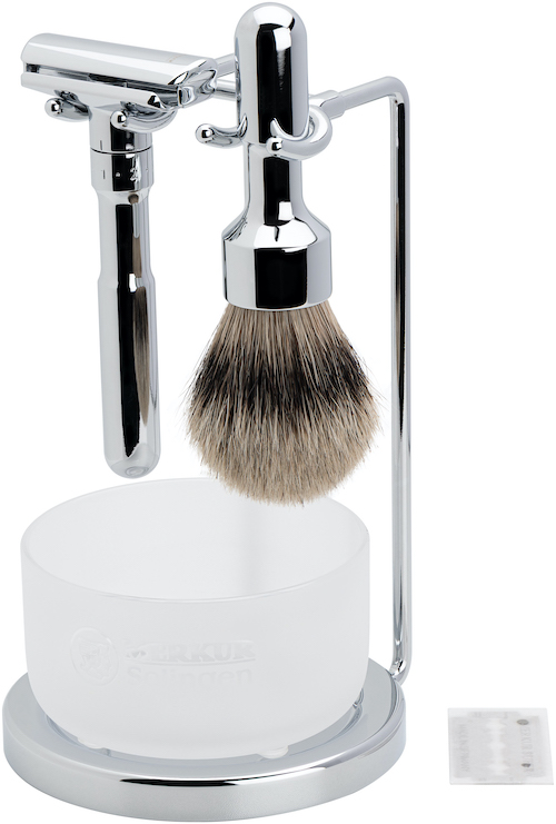 MERKUR 4751 (4751001) Rasierständer für die Glanzchrom FUTUR 701 Rasiererserie. Stabiler Teller mit Platz für die Glas-Rasierschale, Zwei Haken für den Rasierer und den Rasierpinsel der Serie.
