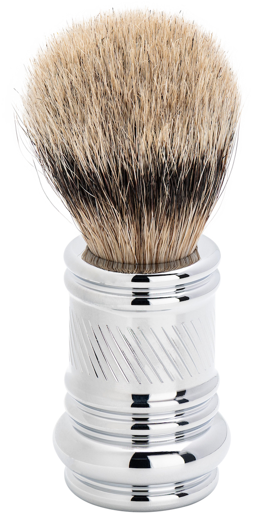 Handle made from aluminum, galvanized bright chrome surface, natural badger hair, silver tip.